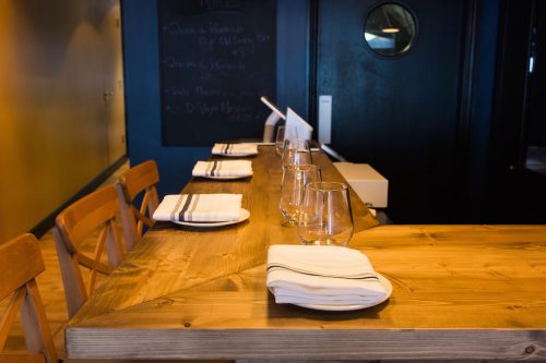 The contemporary and fresh feel of the restaurant was achieved by mixing old and new materials, creating dark, clean, crisp lines in places and more rustic textures in others.